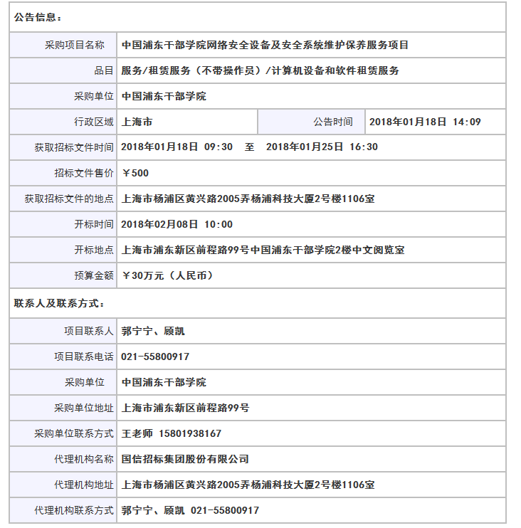 中国浦东干部学院网络安全设备及安全系统维护保养服务项目公开招标公告